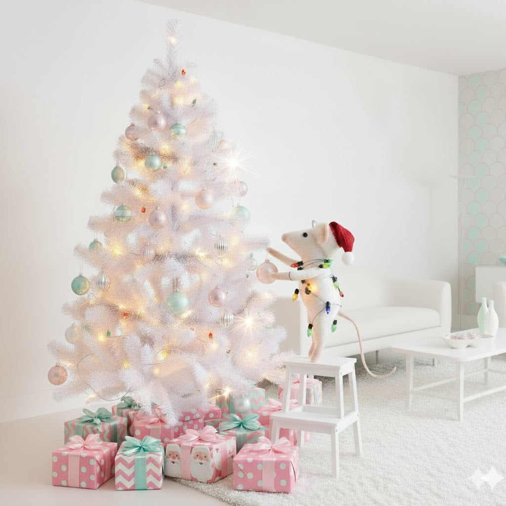 Felt mouse ornament wearing a Santa hat and wrapped in a string of retro lights