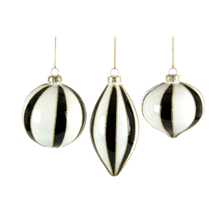 Glass ball Christmas ornaments in three shapes with black and white stripes